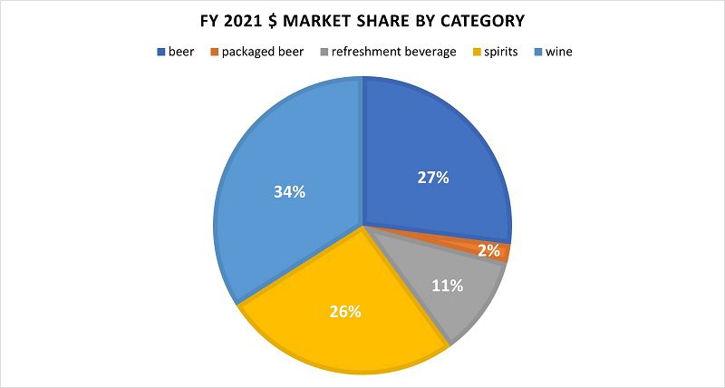 Beer makes up 27% of the market share, second only to wine, but only 1% more than spirits. Despite the popularity of this category, overall beer sales have been declining in recent years. Most impacted by this decline have been manufacturers of larger beer brands, as customer buying patterns suggest consumers are favouring products from smaller manufacturers.